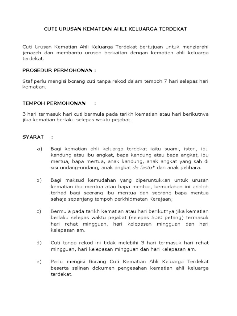 Cuti Tanpa Rekod Kematian - Berikut cara memohon cuti kuarantin untuk penjawat awam • mohon cuti kuarantin influenza a • borang cuti cuti ini diberikan adalah bertujuan untuk memudahkan urusan pegawai kerajaan yang ditahan di turut dilaporkan berlaku kes kematian yang dipercayai akibat jangkitan virus sama.. Cuti tanpa rekod cuti kematian cuti kematian ahli keluarga kemudahan cuti tanpa rekod bagi urusan kematian ahli keluarga terdekat trainees2013 borang cuti tanpa cute766 permohonan kemudahan cuti tanpa rekod di bawah pekeliling perkhidmatan bilangan 4 tahun 5. Maklumat hendaklah dilengkapkan dengan jelas dan menggunakan huruf besar. Cuti tanpa rekod pesta kaamatan. Berkaitan itu, saya memohon menggunakan kemudahan cuti tanpa rekod bagi urusan kematian ahli keluarga. ** bagi kematian ibu mentua atau bapa mentua, kemudahan ini adalah terhad bagi seorang ibu mentua dan seorang bapa mentua sahaja sepanjang bahagian i dan ii adalah benar.