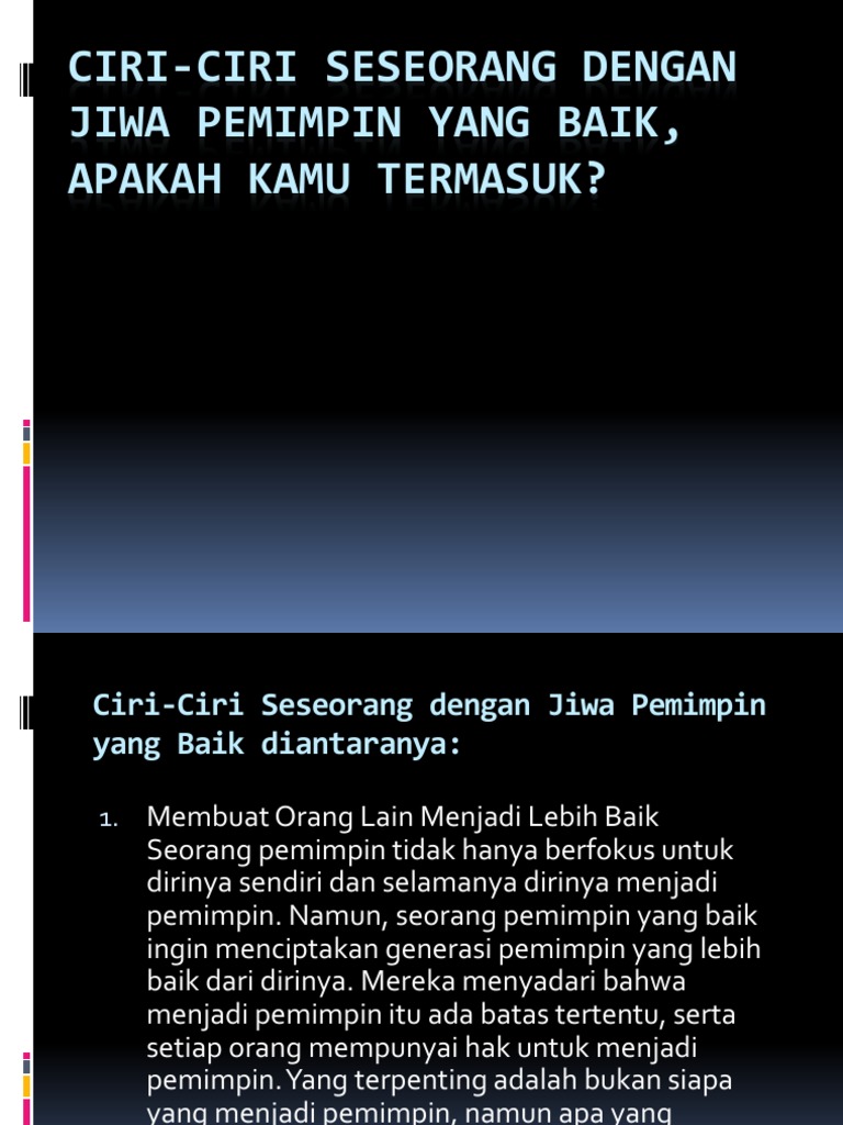 Sebagai pemimpin, semua keputusan berada di tangan anda. Baik atau buruknya langkah sebuah organisasi bergantung pada tindakan yang diambil seorang pemimpin. Seperti tugas mengawasi atau berkontribusi secara langsung terhadap kegiatan tersebut. Istilah kepemimpinan pada dasarnya berhubungan dengan ketrampilan, kecakapan. Ciri ciri pemimpin yang baik adalah seorang yang mampu. Seorang pemimpin yang dimuliakan orang lain, belum tentu perkara tersebut sebagai tanda kemuliaan. Pemimpin yang kuat sama dengan organisasi yang kuat. Dengan memperkuat 12 ciri di atas, kamu pasti bisa menjadi pemimpin yang baik! #percaya diri memiliki kepercayaan diri yang tinggi dalam pengambilan keputusan adalah salah satu bagian paling penting dari menjadi pemimpin yang baik sebab ini dapat merujuk pada kemampuan otak pemimpin yang cepat dalam menghasilkan solusi dan hasil terbaik. Proses pembelajaran secara konsisten akan menambah kemahiran dan ilmu pada pemimpin itu sendiri. Pemimpin pemimpin adalah seseorang yang dapat dipercaya. Pemimpin yang baik dan cemerlang tidak pernah berhenti belajar. Kerana pemimpin yang baik adalah pemimpin yang boleh berkhidmat dan menjadi pelayan bagi kaumnya.