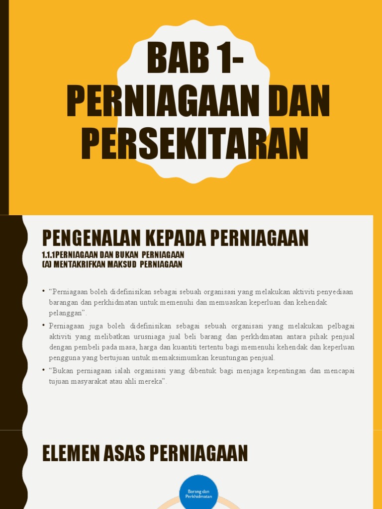 Perniagaan dan persekitaran 1.1 pengenalan perniagaan perniagaan wujud apabila manusia mengkhususkan dalam pengeluaran barangan dan perkhidmatan yang mereka berkemahiran dan cekap.
