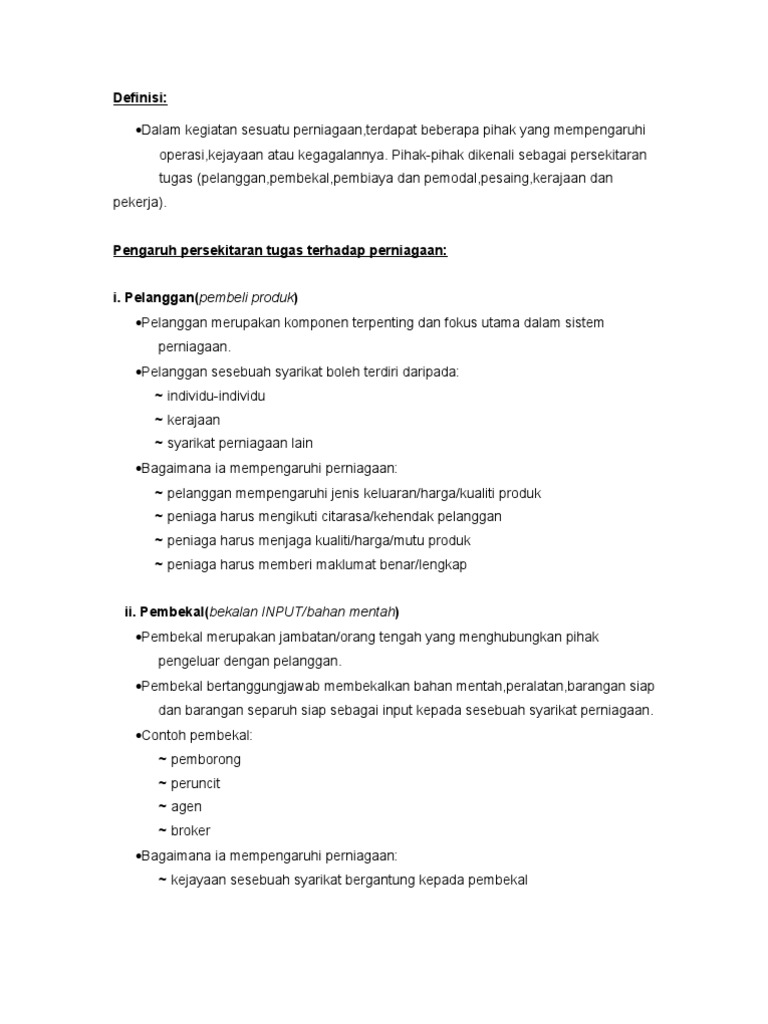 Perniagaan dan persekitaran (maksud, ciri organisasi motif untung). Merupakan satu persekitan di luar organisasi yang memberikan tekanan dan kesan tidak langsung terhadap operasi dan prestasi sesebuah perniagaan. 2 milikan tunggal / perseorangan. Hal ini dapat ditunjukkan dari jumlah penduduk yang hidup dan bekerja pada sektor pertanian atau dari produk nasional yang berasal dari bidang pertanian. Berikut ini adalah definisi pengertian definisi konsep menurut para ahli: Memberi impak kepada prestasi perniagaan usahawan. Menurut alkali (2012), persekitaran perniagaan terdiri daripada persekitaran luaran dan dalaman yang akan mempengaruhi serta. 4 persekitaran perniagaan ialah keadaan, situasi atau suasana dalaman atau luaran organisasi yang boleh mempengaruhi usahawan dalam membuat keputusan. Sedangkan pendapat ahli mengenai arti pertanian, antara lain adalah sebagai berikut Diterbitkan olehridwan lie telah diubah 2 tahun yang lalu. Persekitaran perniagaan yang lebih kondusif, kecanggihan teknologi komunikasi maklumat 2004). Bab 1 perniagaan dan persekitaran. Pengertian pertanian menurut para ahli.